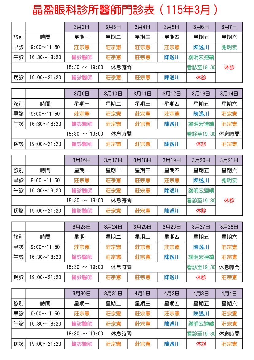 晶盈眼科診所醫師門診表(115年3月)